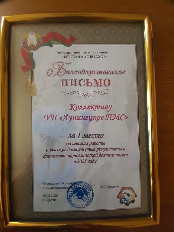 Завершился совет церемонией награждения. Благодарственного письма за первое место по итогам работы за 2025 год удостоен коллектив Лунинецкого ПМС. Награда вручена Александру Кулешу.