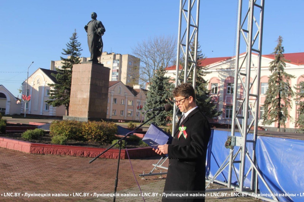 В день 106-й годовщины Октябрьской революции на площади Ленина в Лунинце на торжественный митинг собрались представители ветеранских и общественных организаций, райисполкома и общественности.