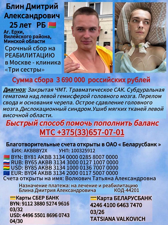 Дима долгое время пробыл в коме, сейчас у него работают только глаза. Ему требуются длительное дорогостоящее лечение и реабилитация. Открыты благотворительные счета для сбора средств. Самый быстрый способ помочь - пополнить баланс МТС +375 (33) 657 07 01.