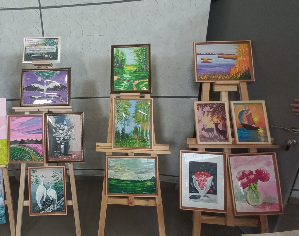 На выставку представлено 13 картин от 7 авторов (живопись, акрил), занимающихся творчеством в инклюзивной арт-студии "В фокусе палитры".