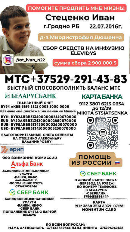 Иван Стеценко из Гродно очень ждет помощи от всех неравнодушных людей. У мальчика – мышечная дистрофия Дюшенна-Бекера и ему просто жизненно необходимо очень дорогое лекарство.