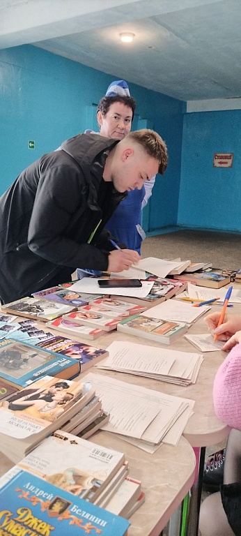 Библиотека расположилась возле актового зала. Все желающие в этот день смогли записаться в библиотеку и взять литературу.
