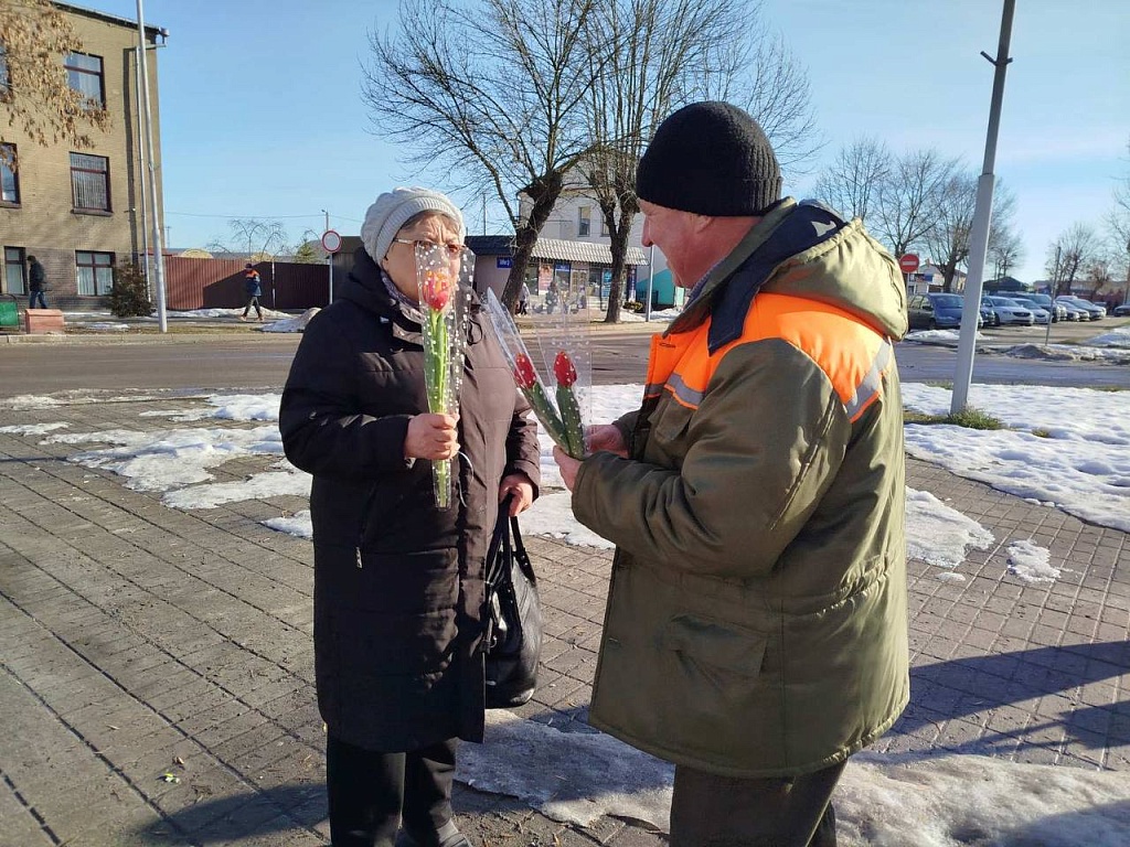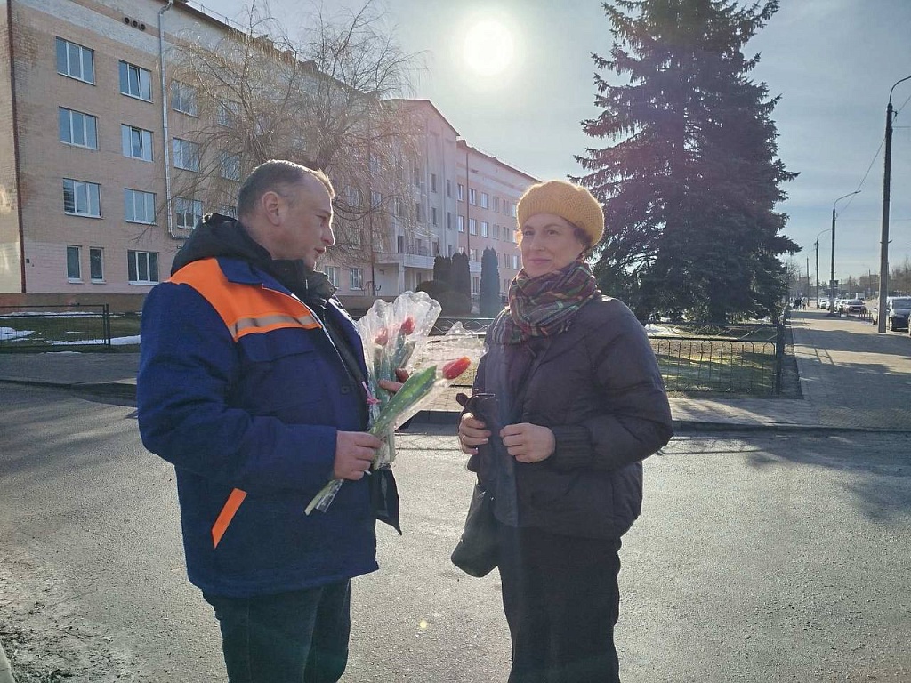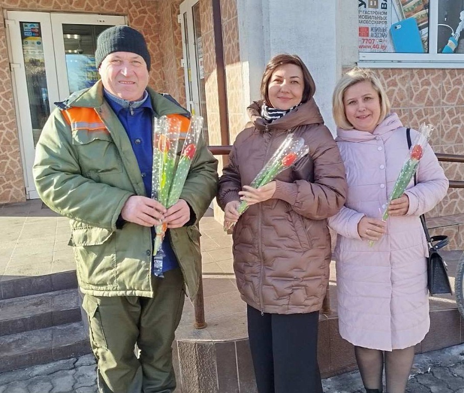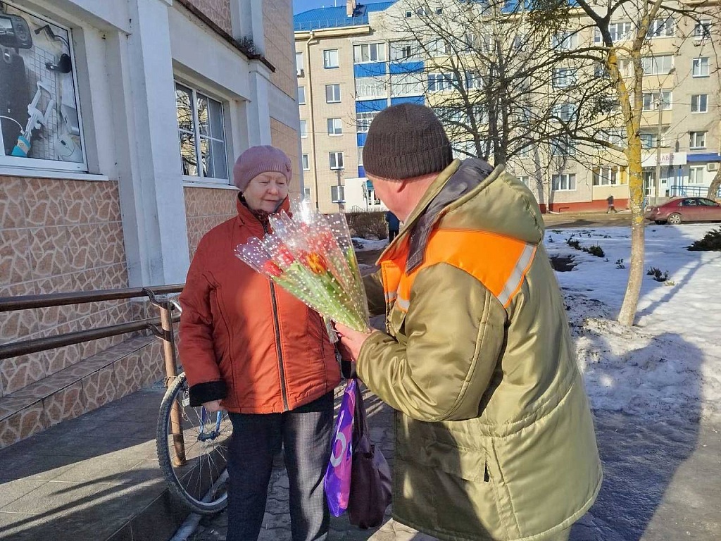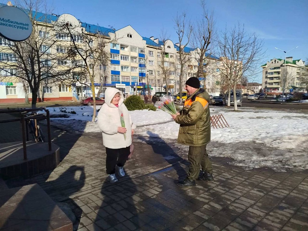 Работники ЖКХ на улицах Лунинца дарили женщинам цветы!