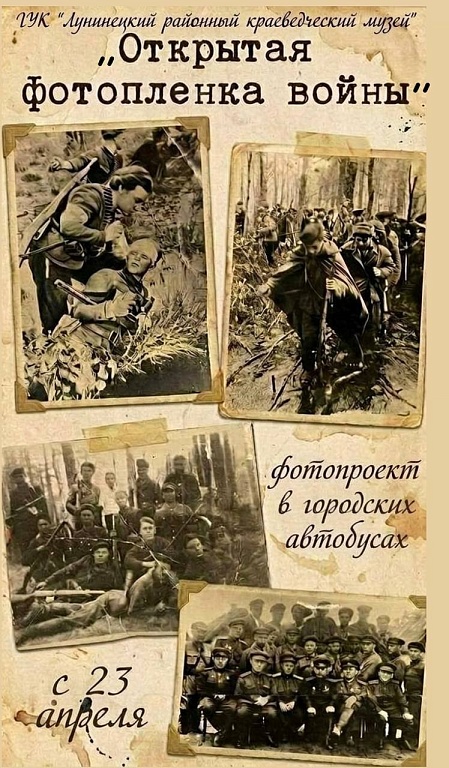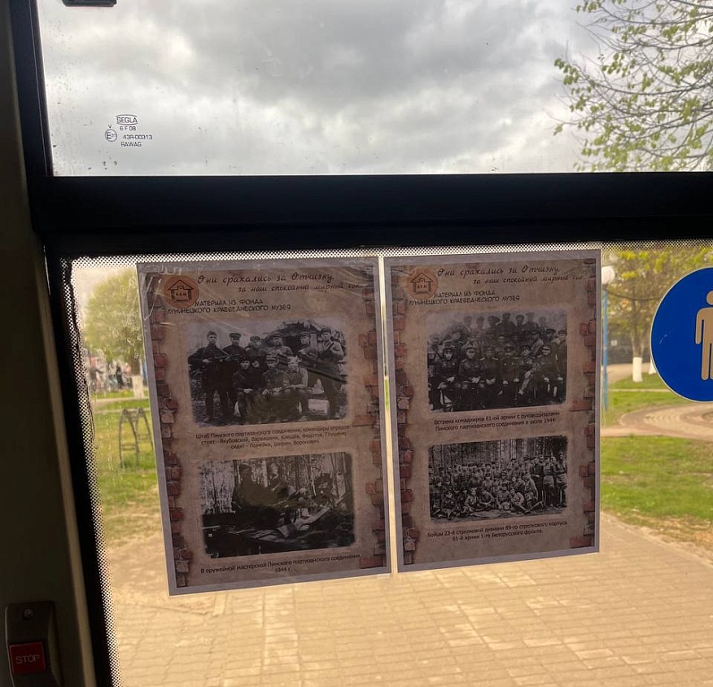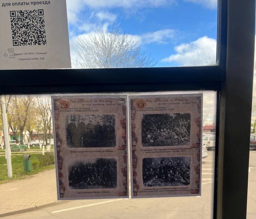 С 23 апреля по 15 мая в городских автобусах Лунинца проходит выставка. ГУК «Лунинецкий районный краеведческий музей» подготовил фотопроект «Открытая фотопленка войны».