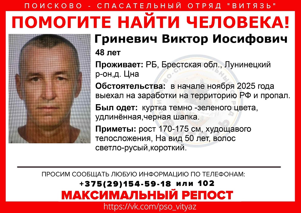 Всех, кто владеет информацией, просим сообщить: ПСО "ВИТЯЗЬ" +375(29)154-59-18 или 102