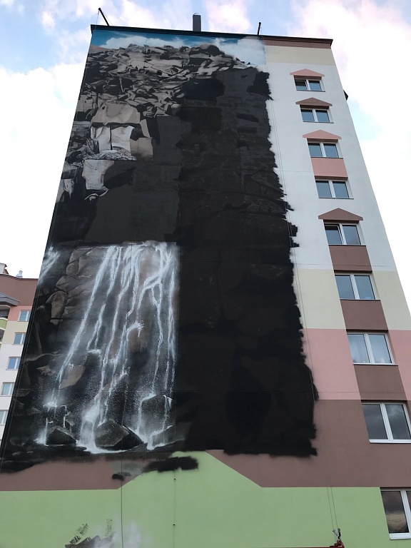 На одной из сторон многоквартирного дома, как в соцсетях сообщает РУПП "Гранит", по инициативе генерального директора предприятия Эдуарда Гаврилковича сейчас ведутся работы над созданием 28-метрового мурала.