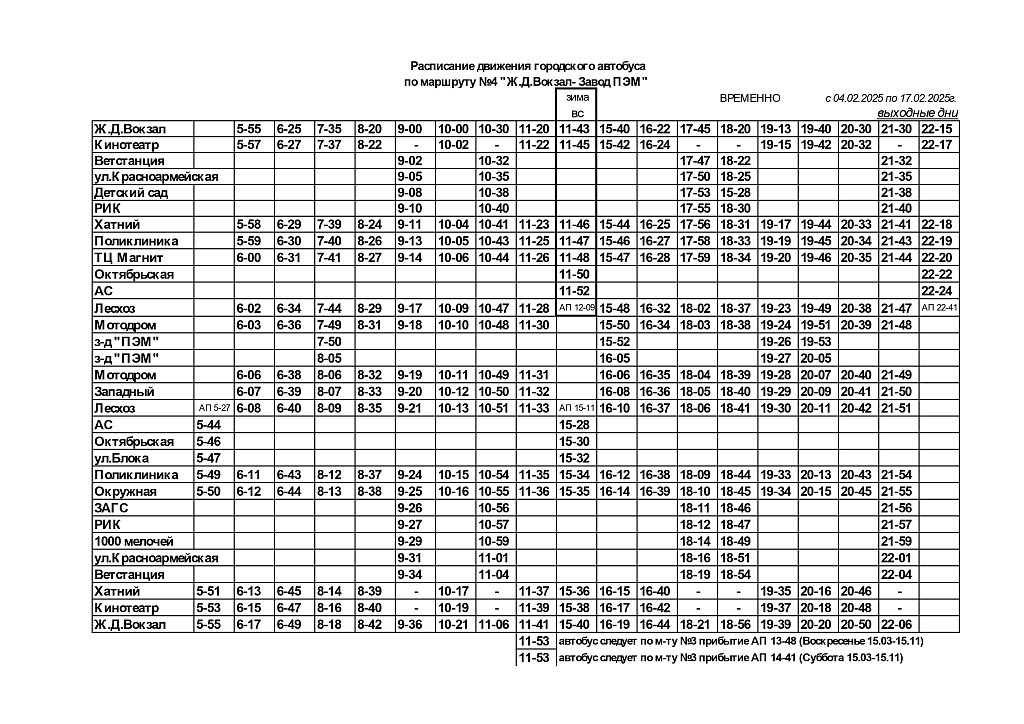 С 4 по 17 февраля временно изменяется движение автобусного маршрута №4 в Лунинце.