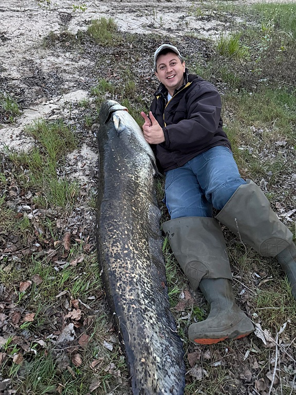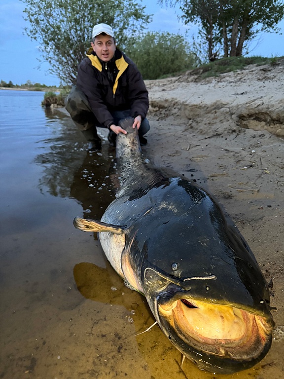 «26 апреля рыбачили с кумом на Припяти в окрестностях Мозырского района. Поклевка случилась около восьми часов вечера и сразу стало понятно, что на крючке сидит крупный сом. Вываживание длилось минут тридцать, и на протяжении всего этого времени рыба не поддавалась, пытаясь уйти в глубину. Сдался сом лишь совсем обессилевши и глотнув воздуха, после чего я смог подтянуть его к берегу, а кум только с третьей попытки вытянул гиганта из воды», — рассказал Федор.