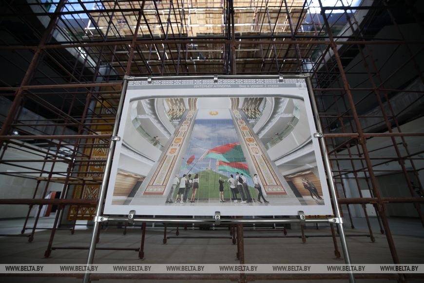 Речь также шла о сроках завершения всех работ и возможном открытии музея к знаковой для Беларуси дате 17 сентября - Дню народного единства. Работы по фасаду здания - остекление и кровельные работы - фактически полностью завершены.
