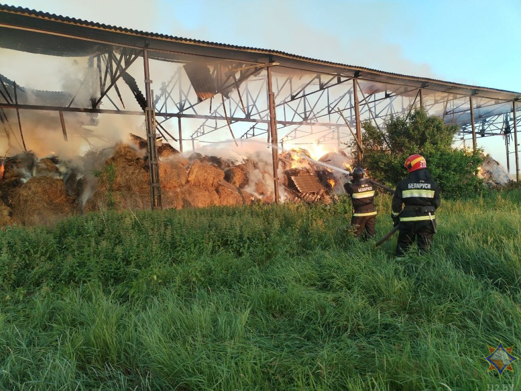 Загорание произошло вечером 26 июня в сенохранилище вблизи агрогородка Миловиды. В результате пожара огнем уничтожена шиферная кровля металлического навеса, 20 т соломы и 20 т сена 2024 года укоса.