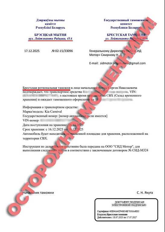 Мною оплачен таможенный сбор за ввоз автомобиля. Московской таможней был рассчитан таможенный утилизационный сбор и на Брестской таможне получен запрет на вывоз авто в Российскую Федерацию. Мне предоставили письмо с вашей электронной подписью, однако в нем много несоответствий. Направлялось ли Брестской таможней в адрес компании представленное мною письмо?